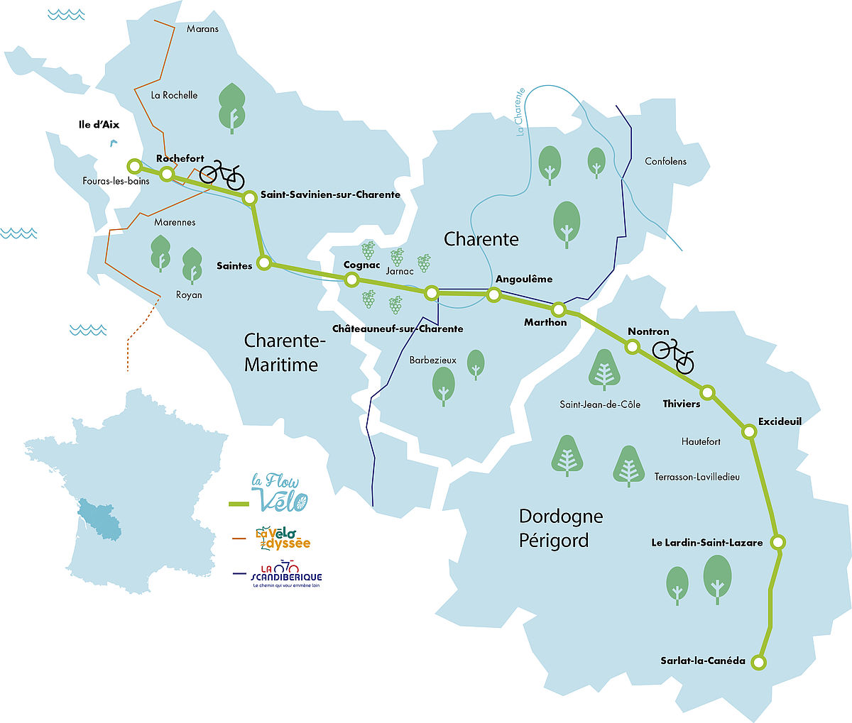 - Itinéraire chic et bucolique, longeant le fleuve Charente et traversant des paysages variés (vignobles du cognac, villes d’art et d’histoire comme Angoulême, Cognac, Saintes et Rochefort).